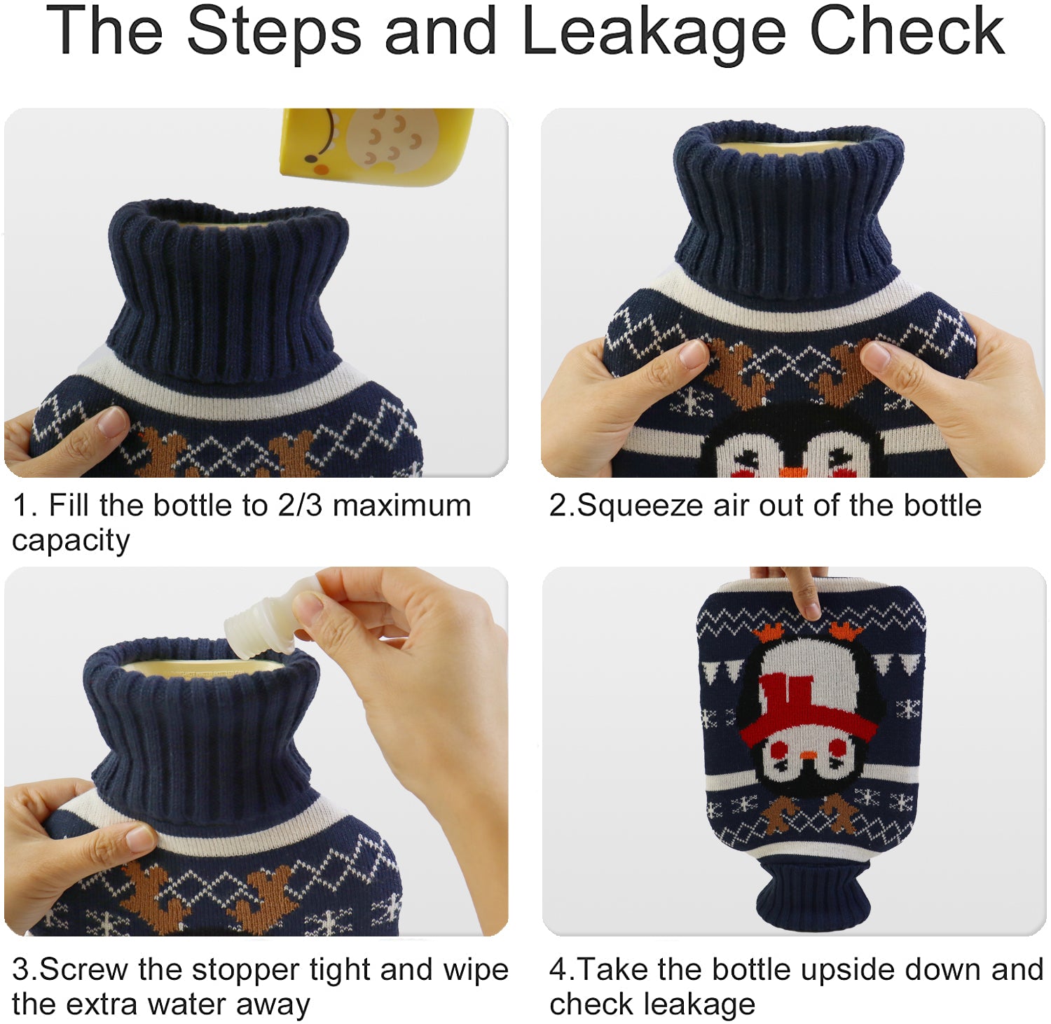 2. Remember to only inject 2/3 of the hot water in the hot water bottle. It should not be filled to avoid the expansion of the bag. When the cap is screwed, the hot water overflows and burns.