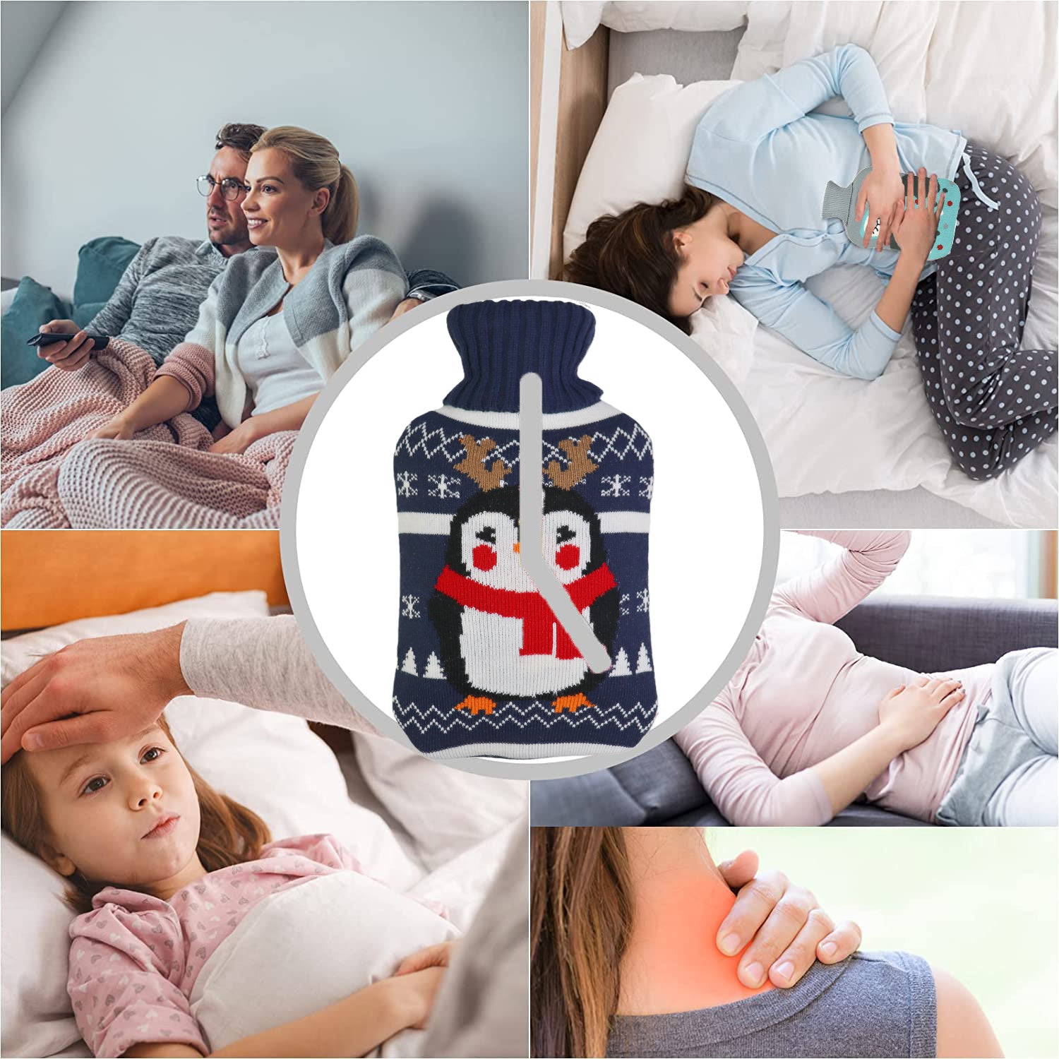 Cozy Nights Hot Water Bottle with Cute Penguin Knitted Cover for Kids, 2L