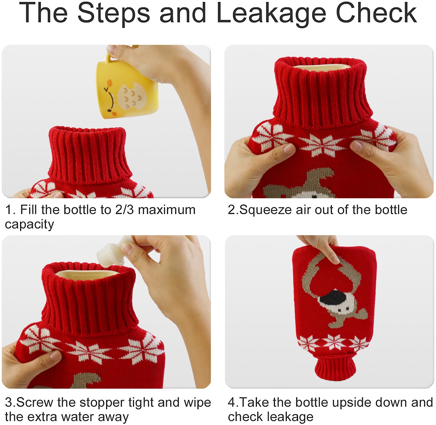 2. Remember to only inject 2/3 of the hot water in the hot water bottle. It should not be filled to avoid the expansion of the bag. When the cap is screwed, the hot water overflows and burns.
