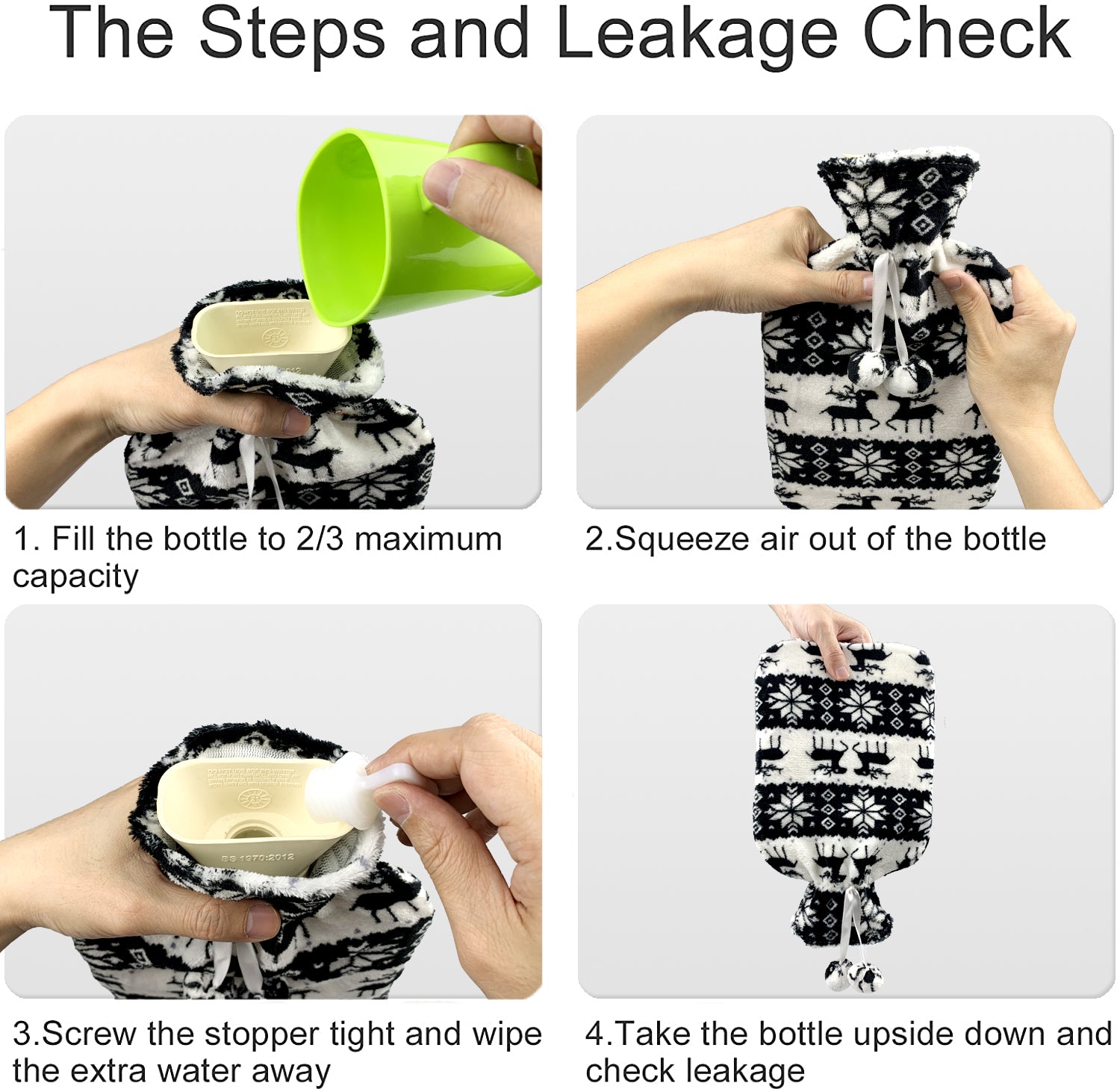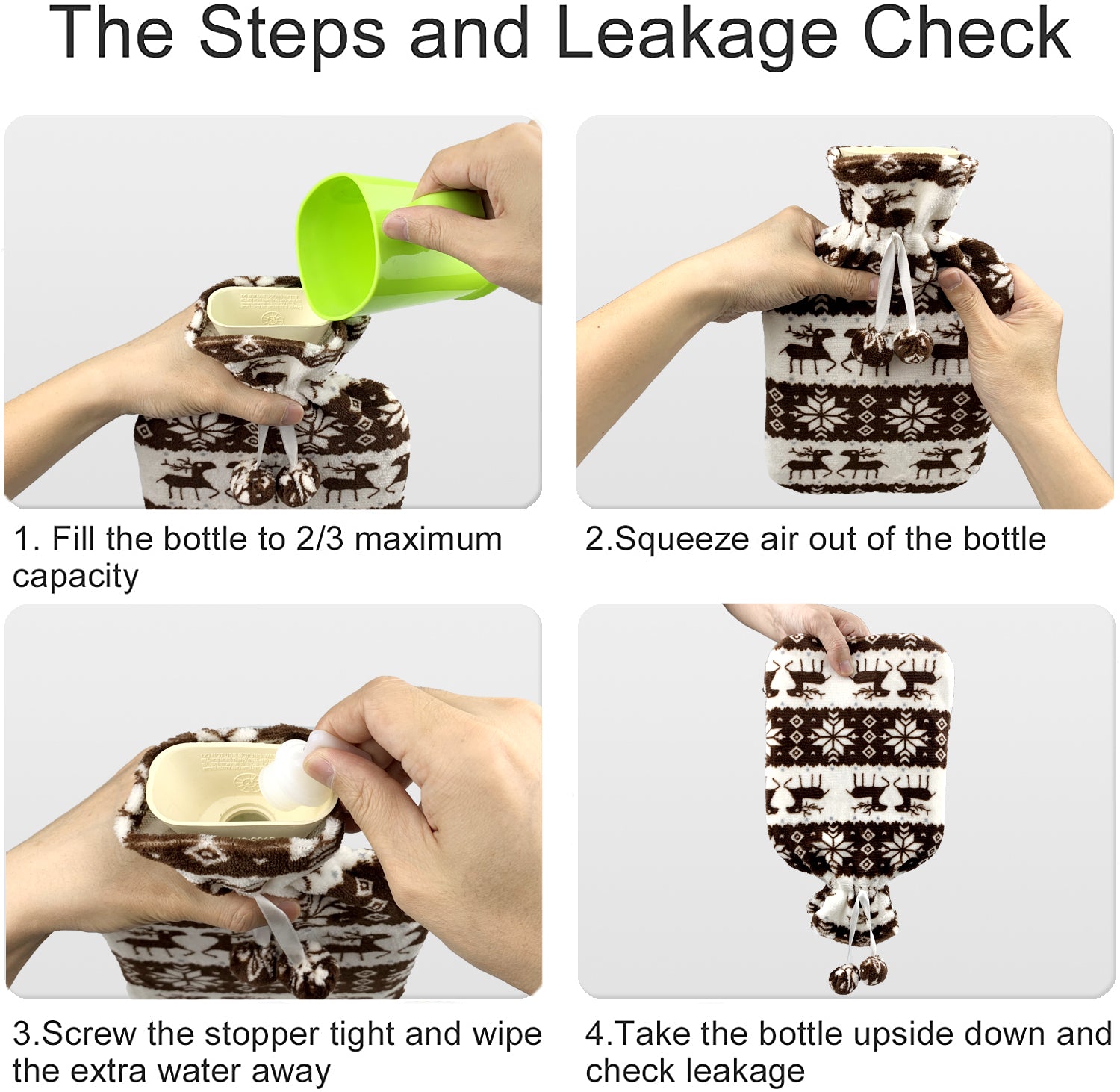 - Fill the bottle with water heated to 80–90°C (avoid boiling water).