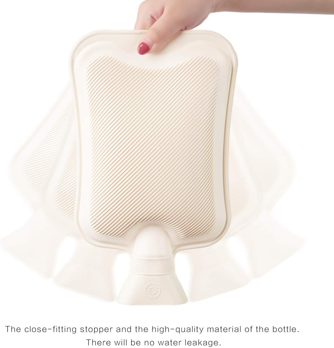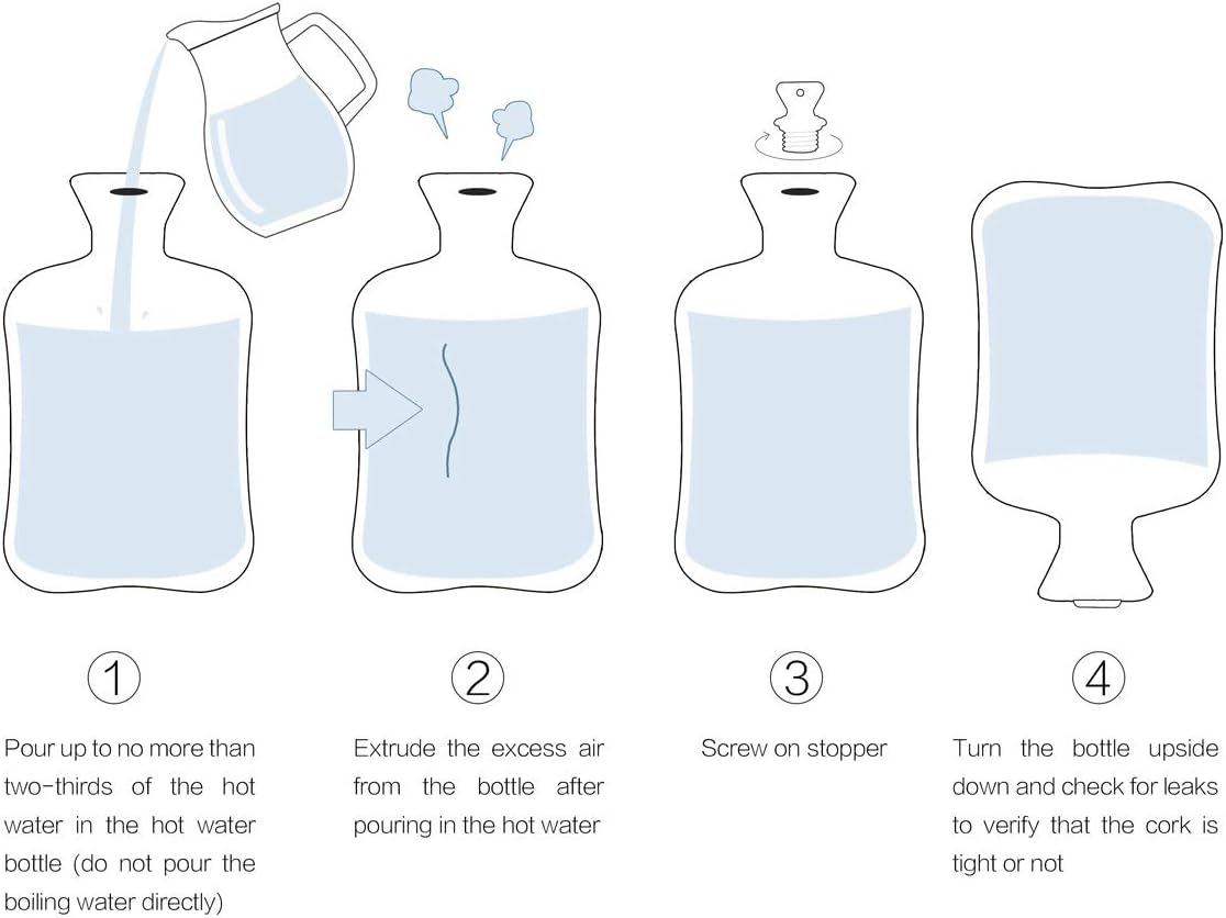 2. Remember to only inject 2/3 of the hot water in the hot water bottle. It should not be filled to avoid the expansion of the bag. When the cap is screwed, the hot water overflows and burns.