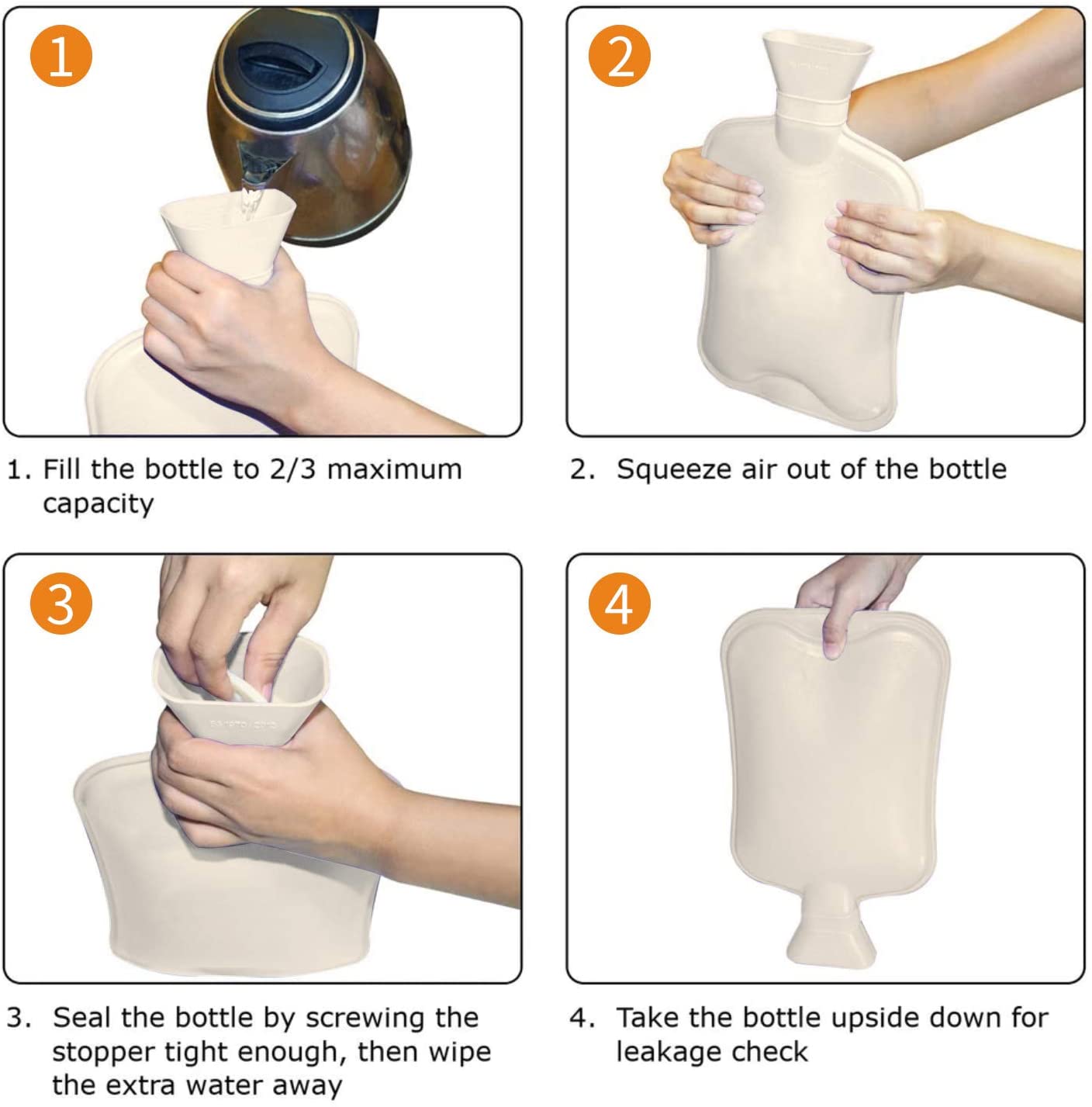 2. Remember to only inject 2/3 of the hot water in the hot water bottle. It should not be filled to avoid the expansion of the bag. When the cap is screwed, the hot water overflows and burns.