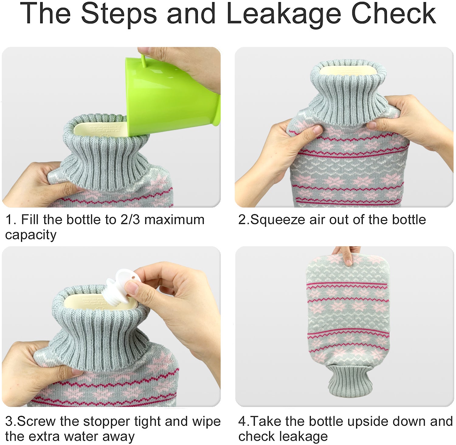 2. Remember to only inject 2/3 of the hot water in the hot water bottle. It should not be filled to avoid the expansion of the bag. When the cap is screwed, the hot water overflows and burns.
